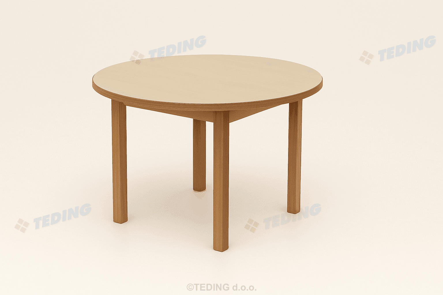 Okrugla ploča od bukove masive sa zaobljenim rubovima daje topao, siguran i smiren vizual za vrtiće i učionice. HPL (ultrapas) površina trpi intenzivnu uporabu, lako se čisti i zadržava izgled kroz godine. Promjeri ø80 i ø90 pokrivaju male čitaonice, skupni rad i igraonice; visina se bira prema dobi djece i tipu sjedenja.